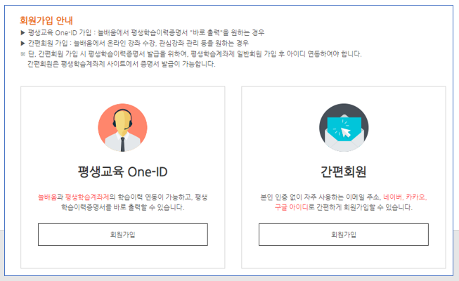 회원가입을 하려면 평생교육 One-ID가 있으면 되는데요. 이 아이디가 있으면 늘배움 사이트 뿐만 아니라 다양한 평생학습계좌제와 학습 이력을 연동할 수 있으며, 평생학습이력증명서도 바로 출력할 수 있다는 장점이 있습니다. 아니면 본인 인증 없이 간편회원으로 회원 가입을 할 수도 있는데요. 이 때는 카카오, 네이버, 구글 아이디가 필요합니다.